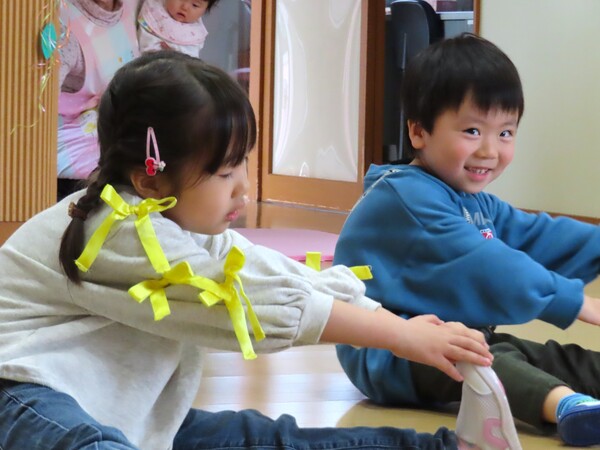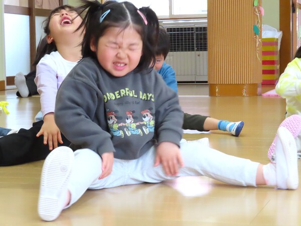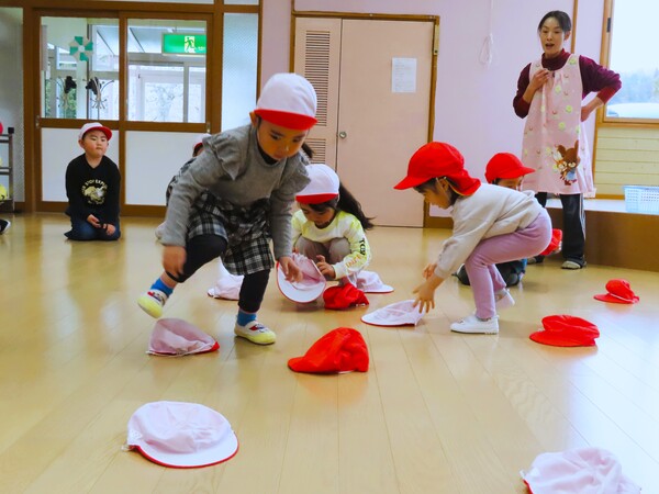体操、ストレッチ、紅白帽を使ったオセロ。